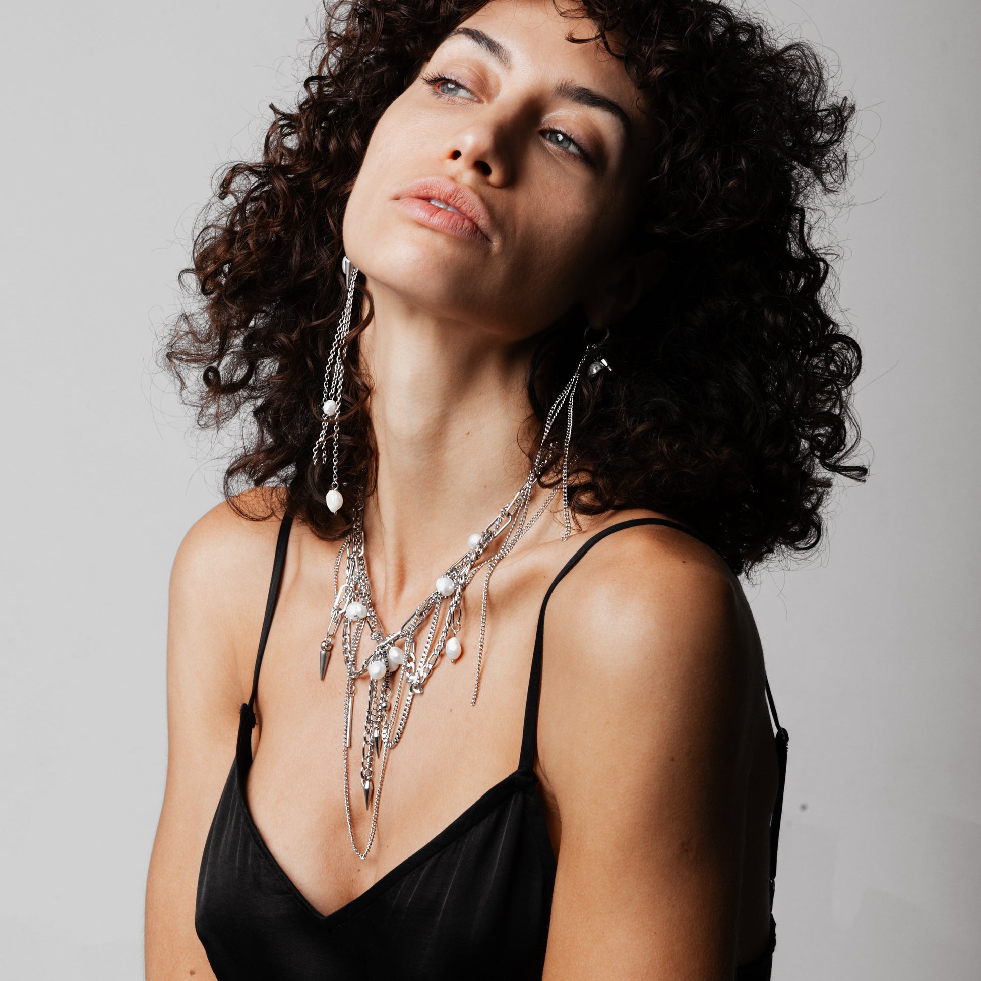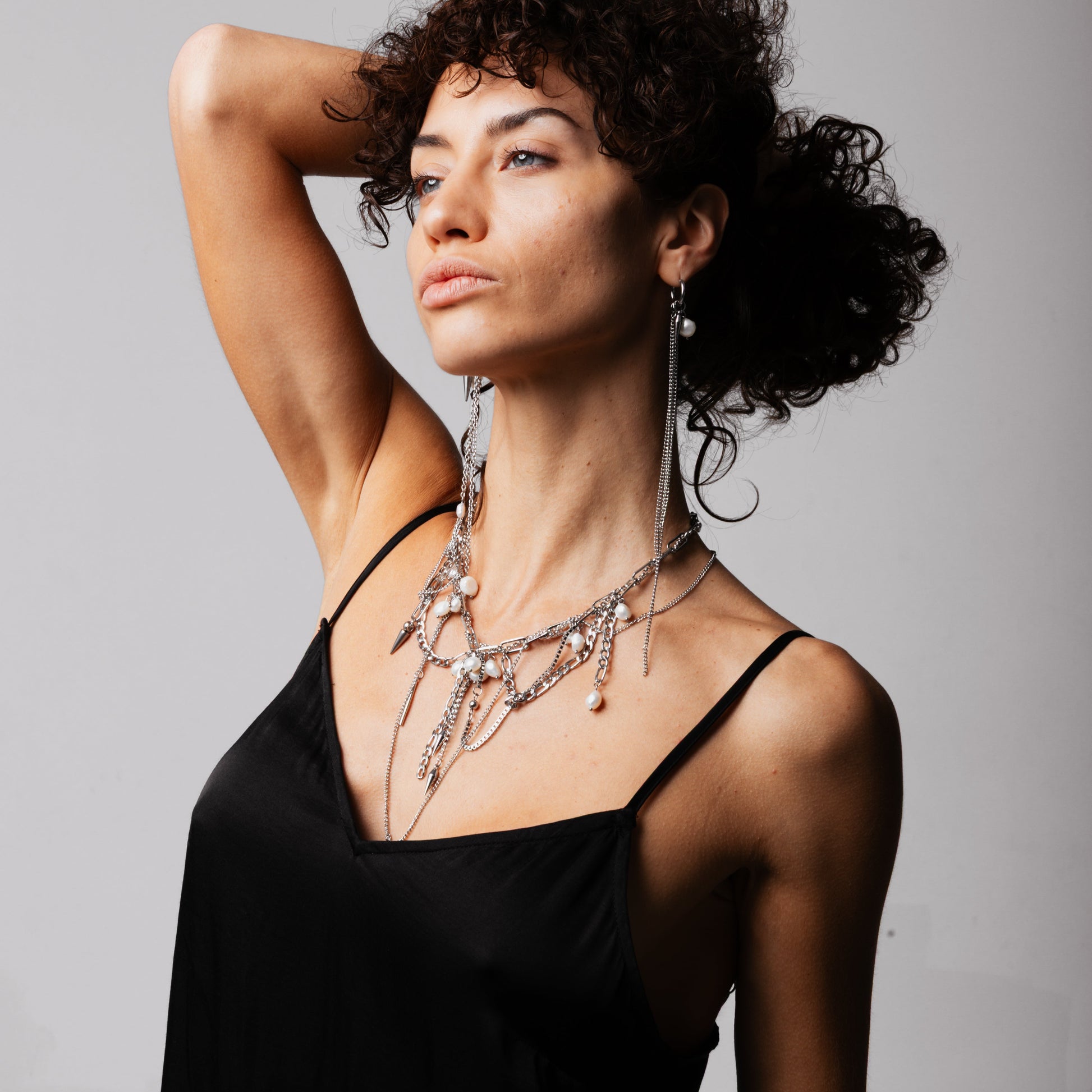 Accesorio audaz con perlas naturales: mezcla de elegancia y estética punk.